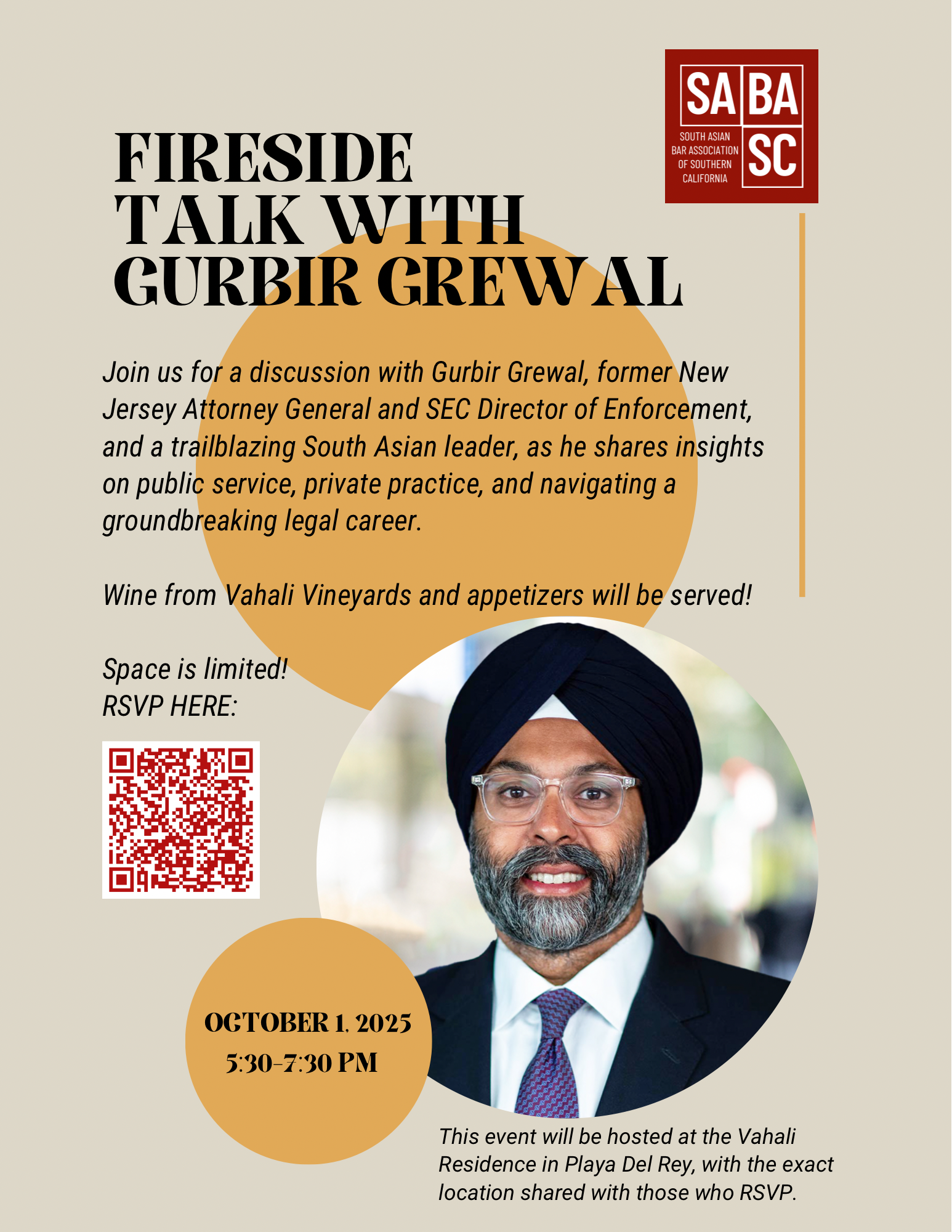 Please join us for an intimate discussion with Gurbir Grewal, former New Jersey Attorney General and SEC Director of Enforcement, as he discusses his career and experiences as a South Asian attorney.