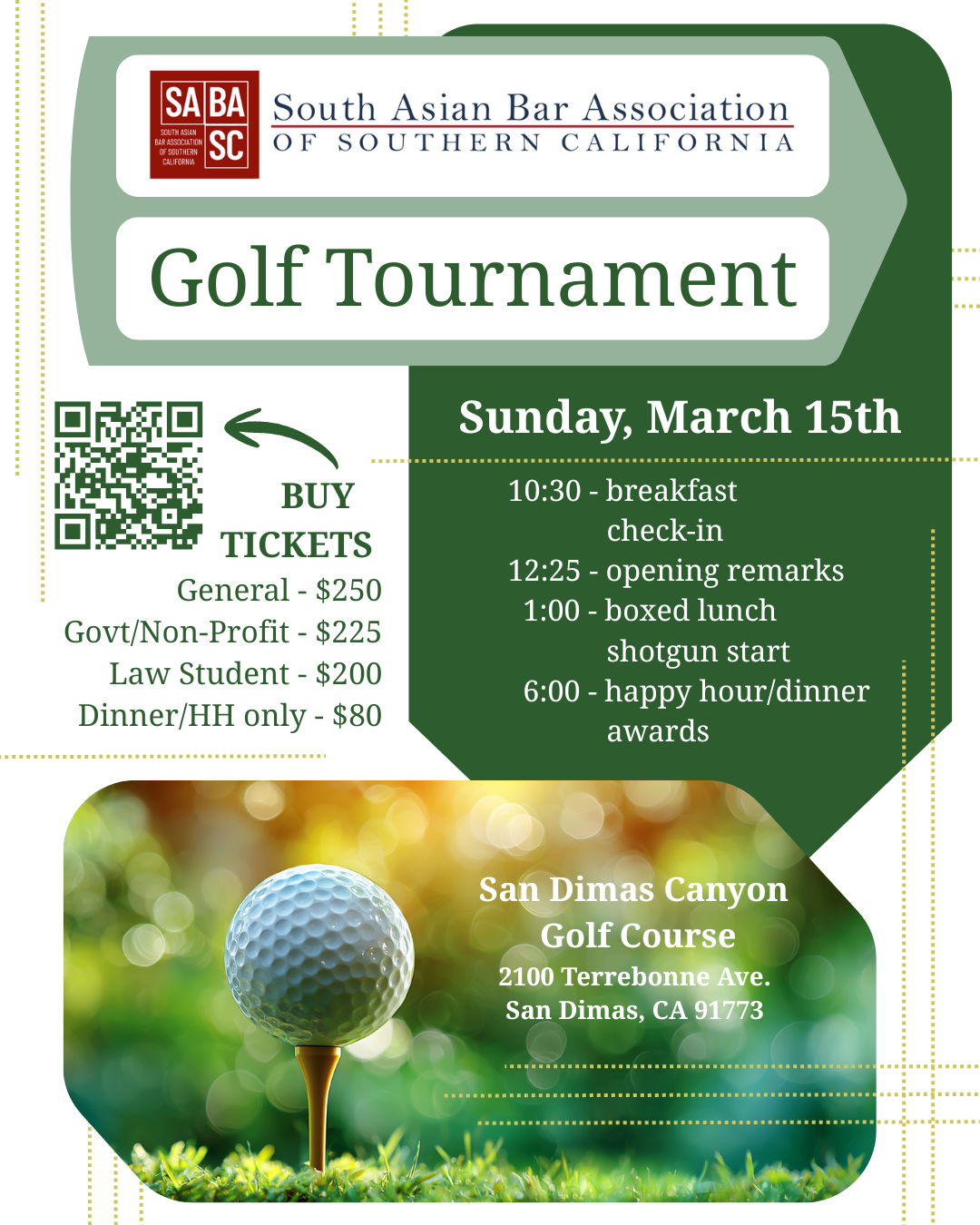 Join us for the South Asian Bar Association of Southern California’s Golf Tournament at the scenic San Dimas Canyon Golf Course (2100 Terrebonne Ave., San Dimas, CA 91773) on SUNDAY MARCH 15 from 10:30AM to 8:00PM.