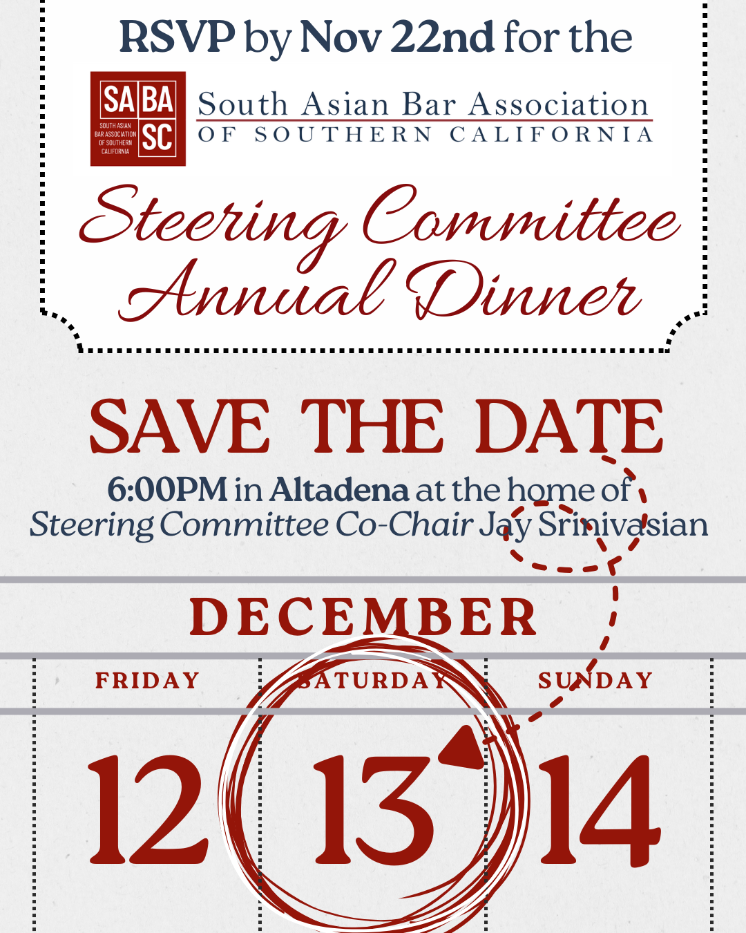 Steering Committee Annual Dinner Saturday, December 13, 2025 6:00 PM 8:30 PM Google Calendar ICS Members of SABA-SC’s Steering Committee are invited to an annual dinner at 6:ooPM on December 13th, 2025; generously hosted by Steering Committee Co-Chair Jay Srinivasan at his home in Altadena. RSVP